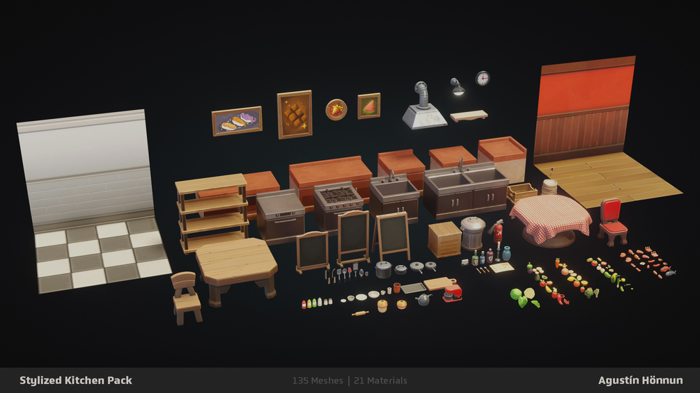 This high-quality kitchen asset pack is designed to bring stylized cooking scenes and environments to life. It includes a complete selection of models for building a fully functional kitchen, featuring everything from furniture and utensils to raw ingredients and surface materials.