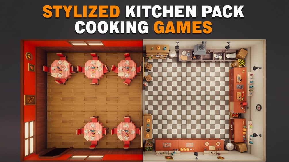 The pack includes essential kitchen structures, cooking tools, a wide variety of stylized ingredients with some cut or prepared versions, modular dining furniture, and matching materials for floors and walls. Ideal for interactive projects, stylized games, VR , or animations. Fully compatible with engines like Unity and Unreal. (Packed for Engines not included).